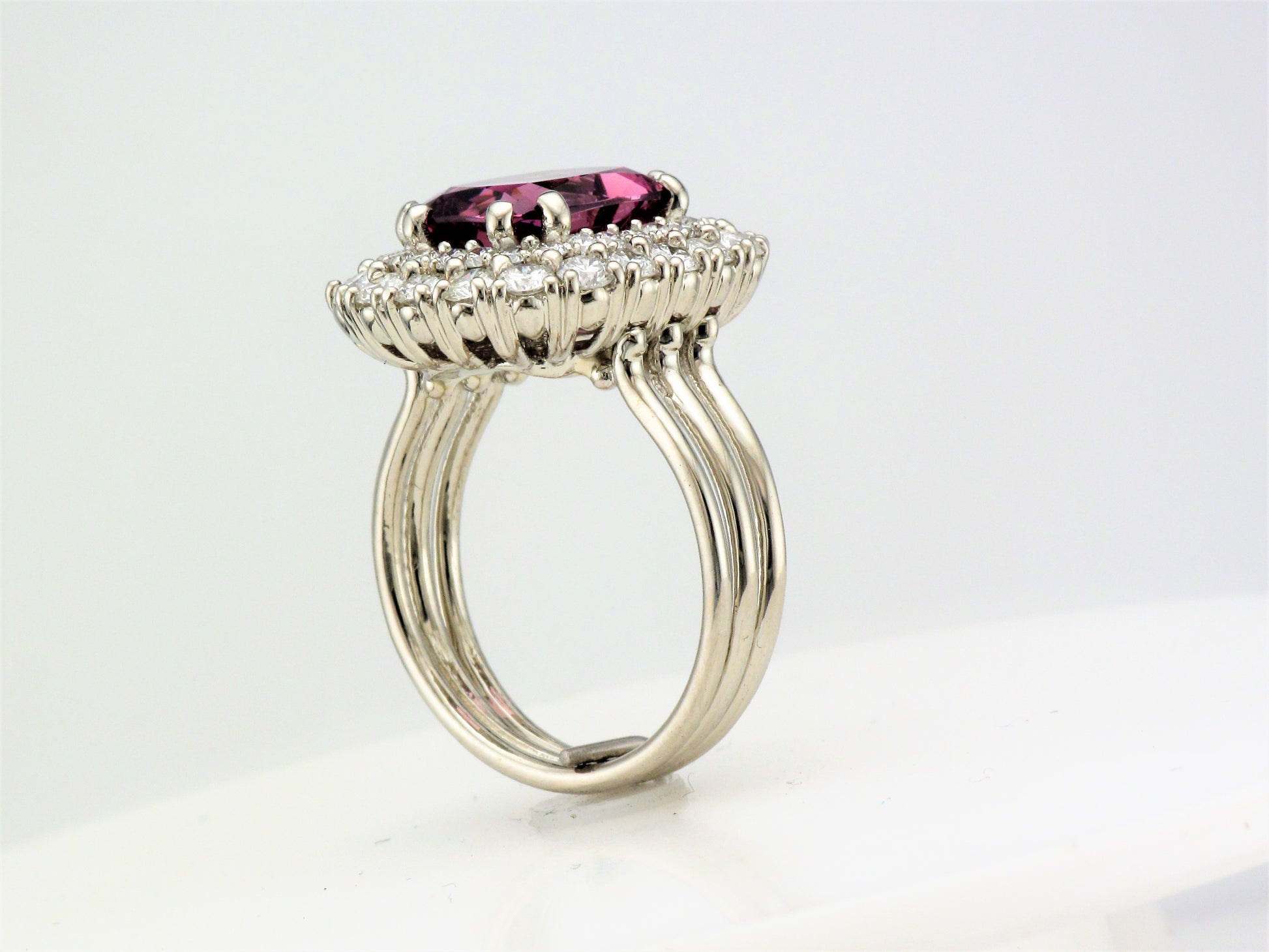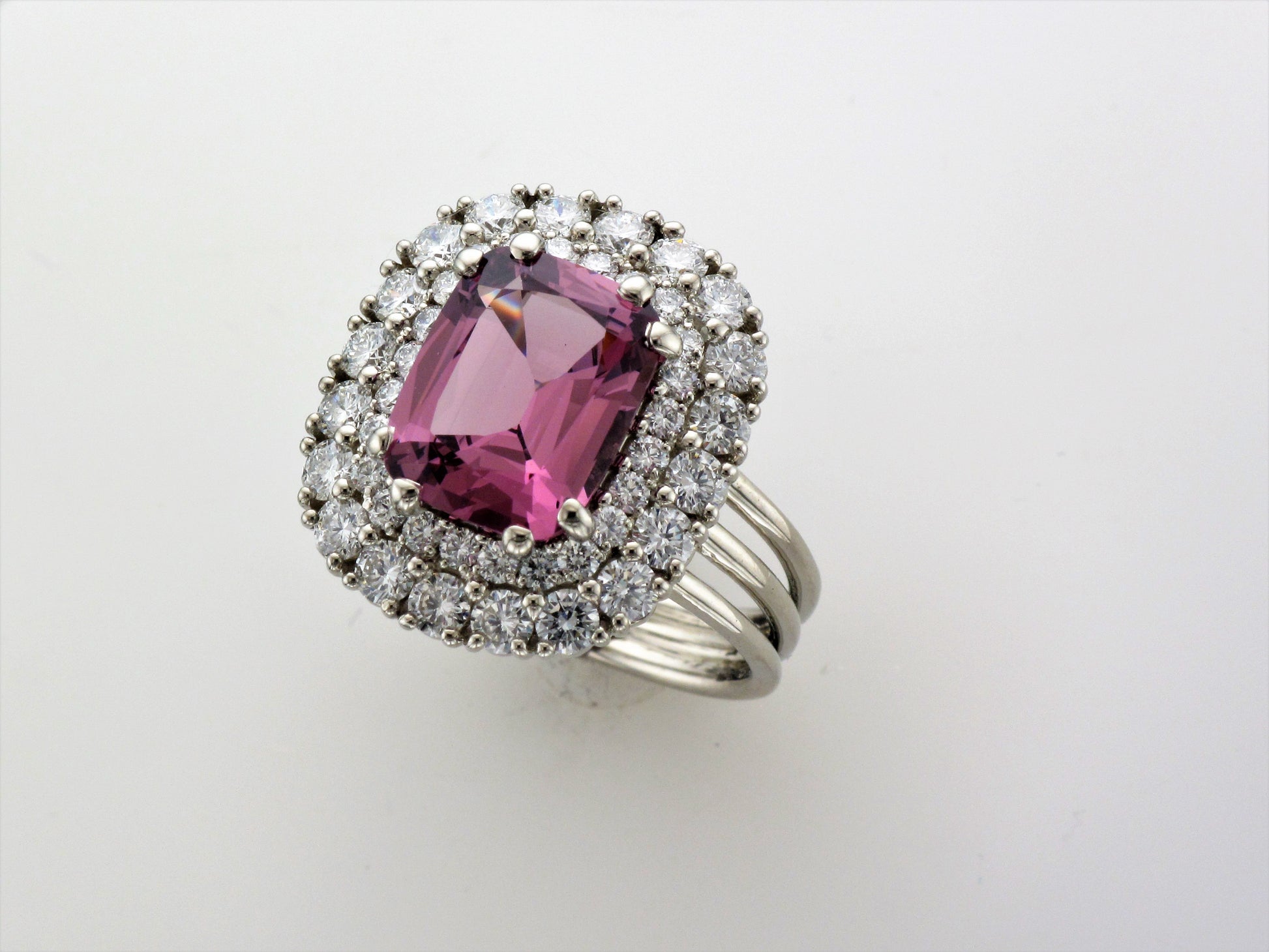 A Barry J. Peterson original creation, this 18KW Gold ring features a Natural 3.52CTW Pink Purple Cushion Cut Spinel from Mogok, Burma. This gem is extra special as it was cut by the famous Glenn Preus. Surrounding this incredible stone are two halos created from 1.25CTW F-G/VS Diamonds set in an 18KW Gold tri-split shank. Resizing and customization optional for an added cost.