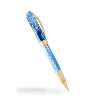 Each pen features special trims and colored resins designed specifically to express the imagery particular to each of Dante's realms. The Inferno (Hell) is made of solid black resin with flaming-red accents and dark ruthenium trims, evoking the fire and darkness of the Inferno. Purgatorio (Purgatory) is equipped with palladium trims, while the resin is taupe-brown as the purgatorial mountain with greyish shades representing the purifying journey of the souls. Finally, Paradiso (Heaven) is a celestial sky-blue with yellow gold trim, symbolizing the holy light and joyful nobility of paradise.